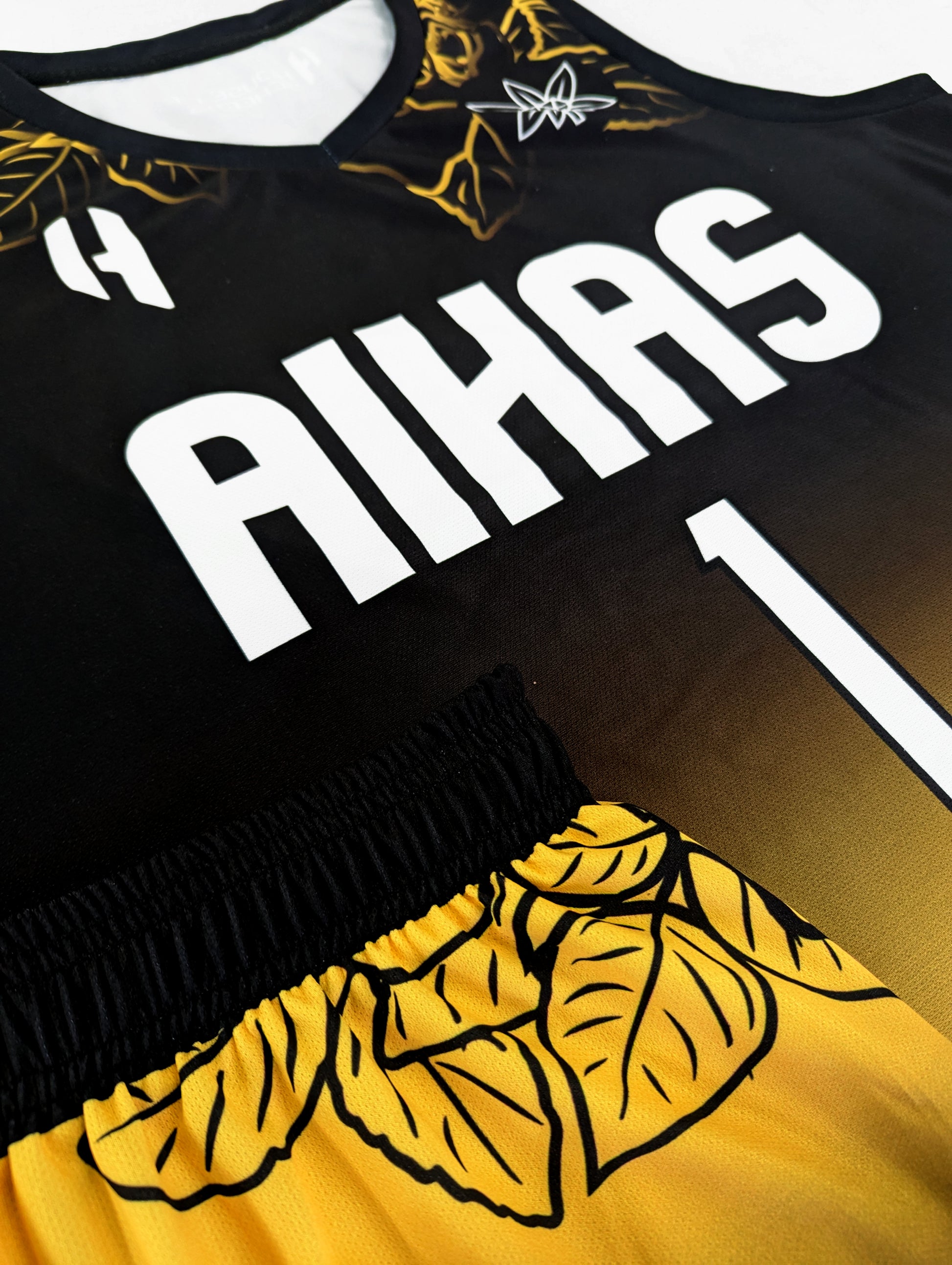 Note: This design was made for another team. You'll receive the same design without the logo displayed on the chest. It'll be printed with a team name of your choice, along with the player name and number and back above the name will have House of Screens branding. It'll be in the format below