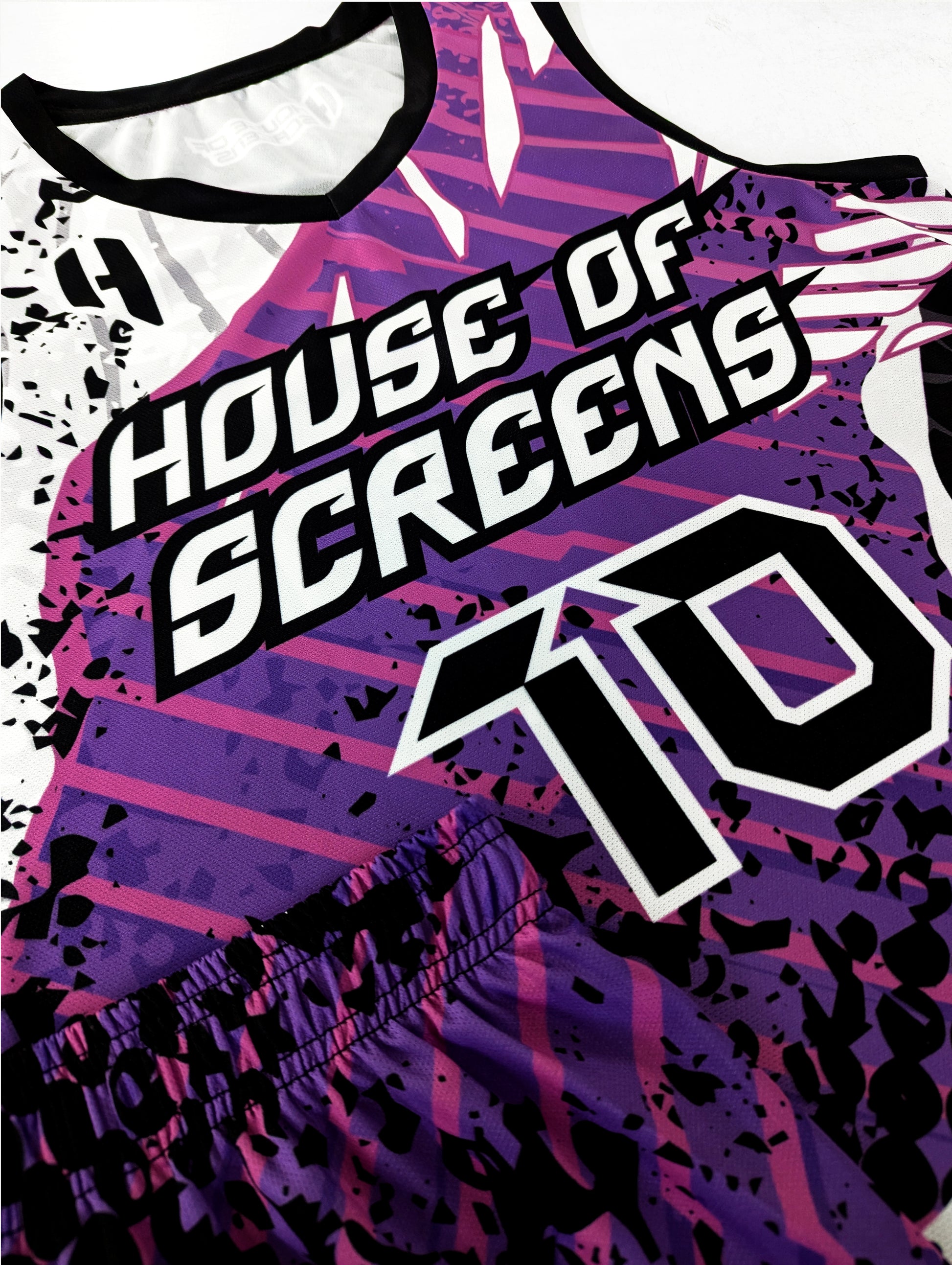Note: This design was made for another team. You'll receive the same design without the logo displayed on the chest. It'll be printed with a team name of your choice, along with the player name and number and back above the name will have House of Screens branding. It'll be in the format below