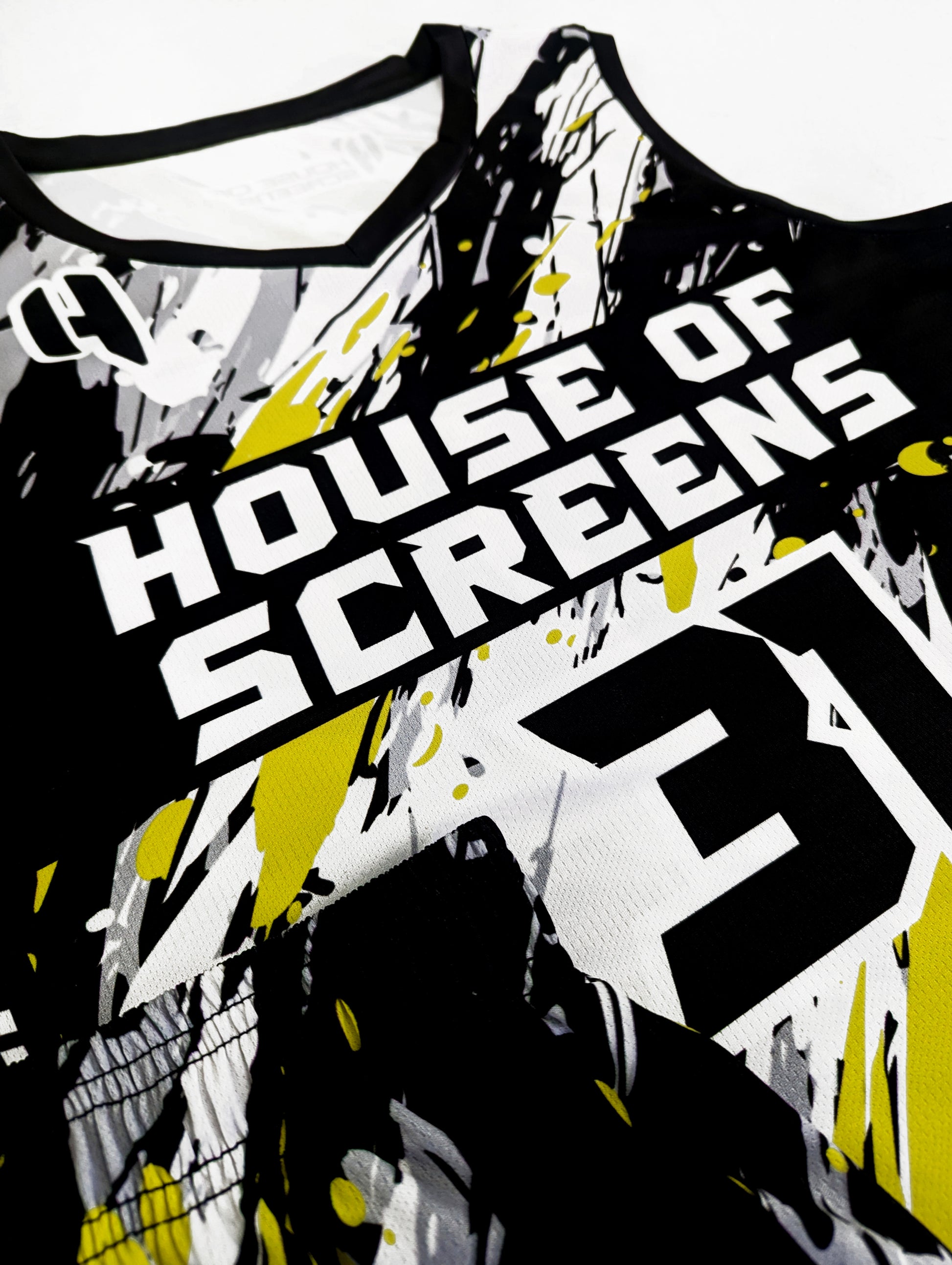 Note: This design was made for another team. You'll receive the same design without the logo displayed on the chest. It'll be printed with a team name of your choice, along with the player name and number and back above the name will have House of Screens branding. It'll be in the format below