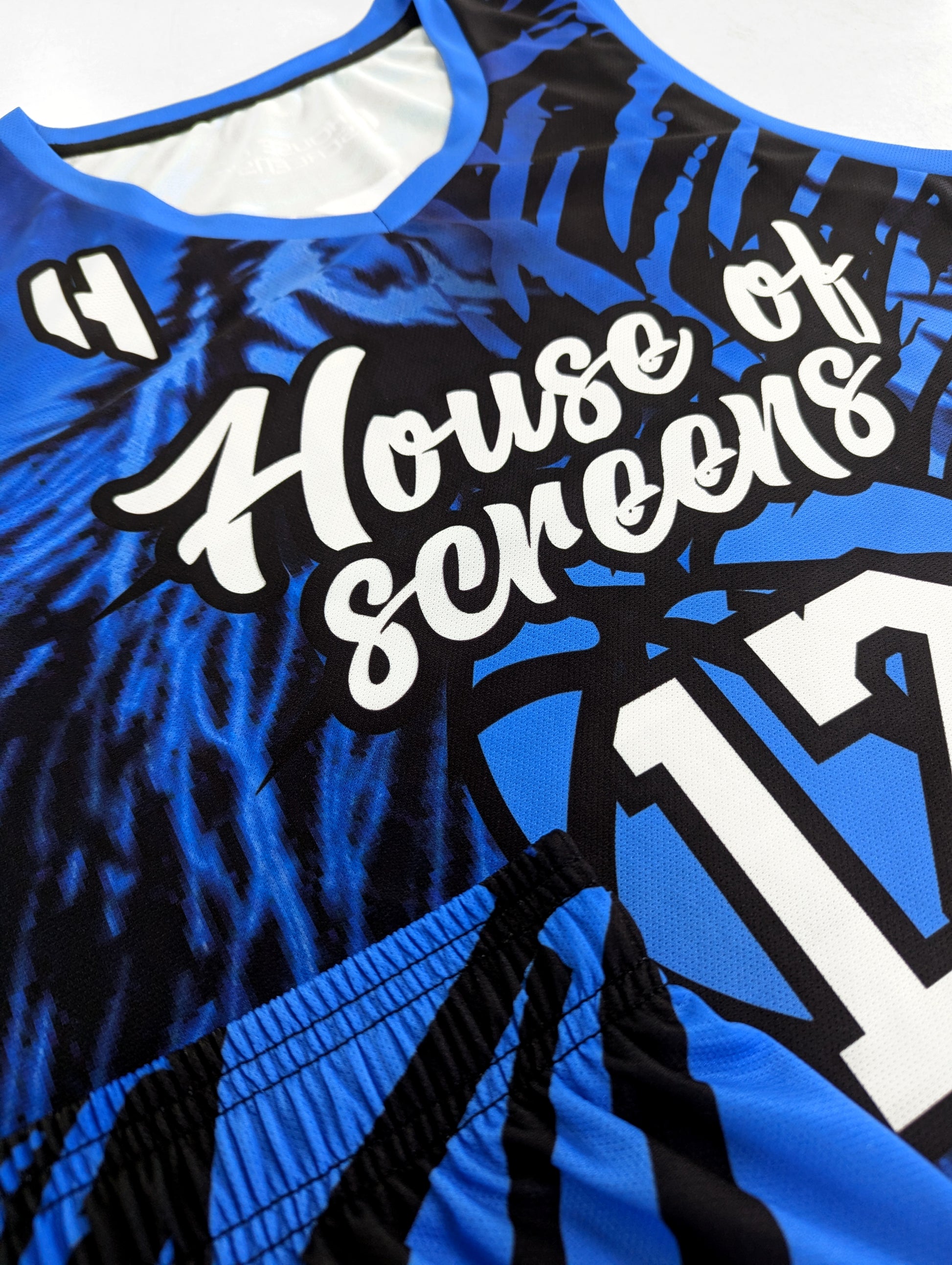 Note: This design was made for another team. You'll receive the same design without the logo displayed on the chest. It'll be printed with a team name of your choice, along with the player name and number and back above the name will have House of Screens branding. It'll be in the format below