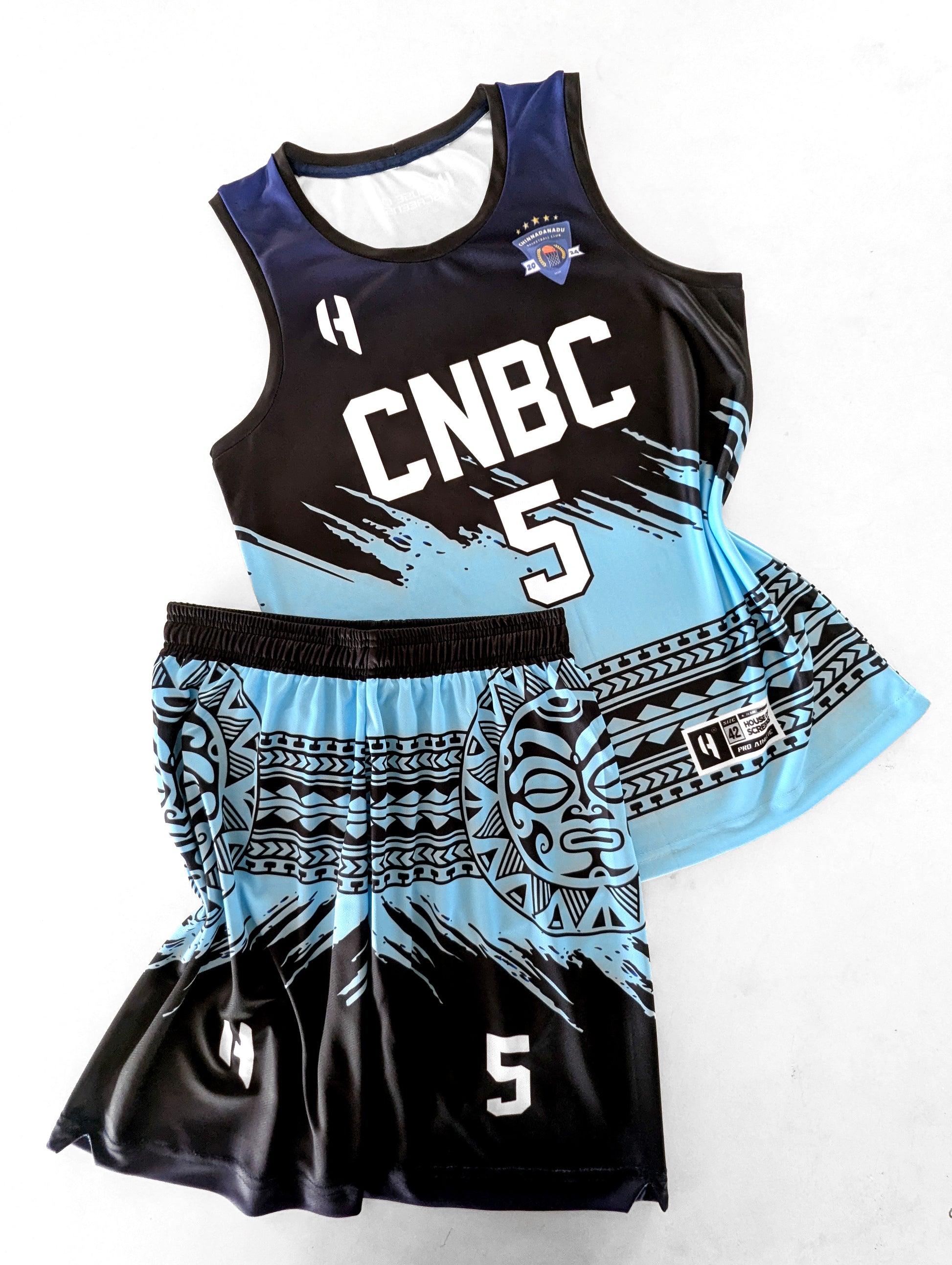 Note: This design was made for another team. You'll receive the same design without the logo displayed on the chest. It'll be printed with a team name of your choice, along with the player name and number and back above the name will have House of Screens branding. It'll be in the format below
