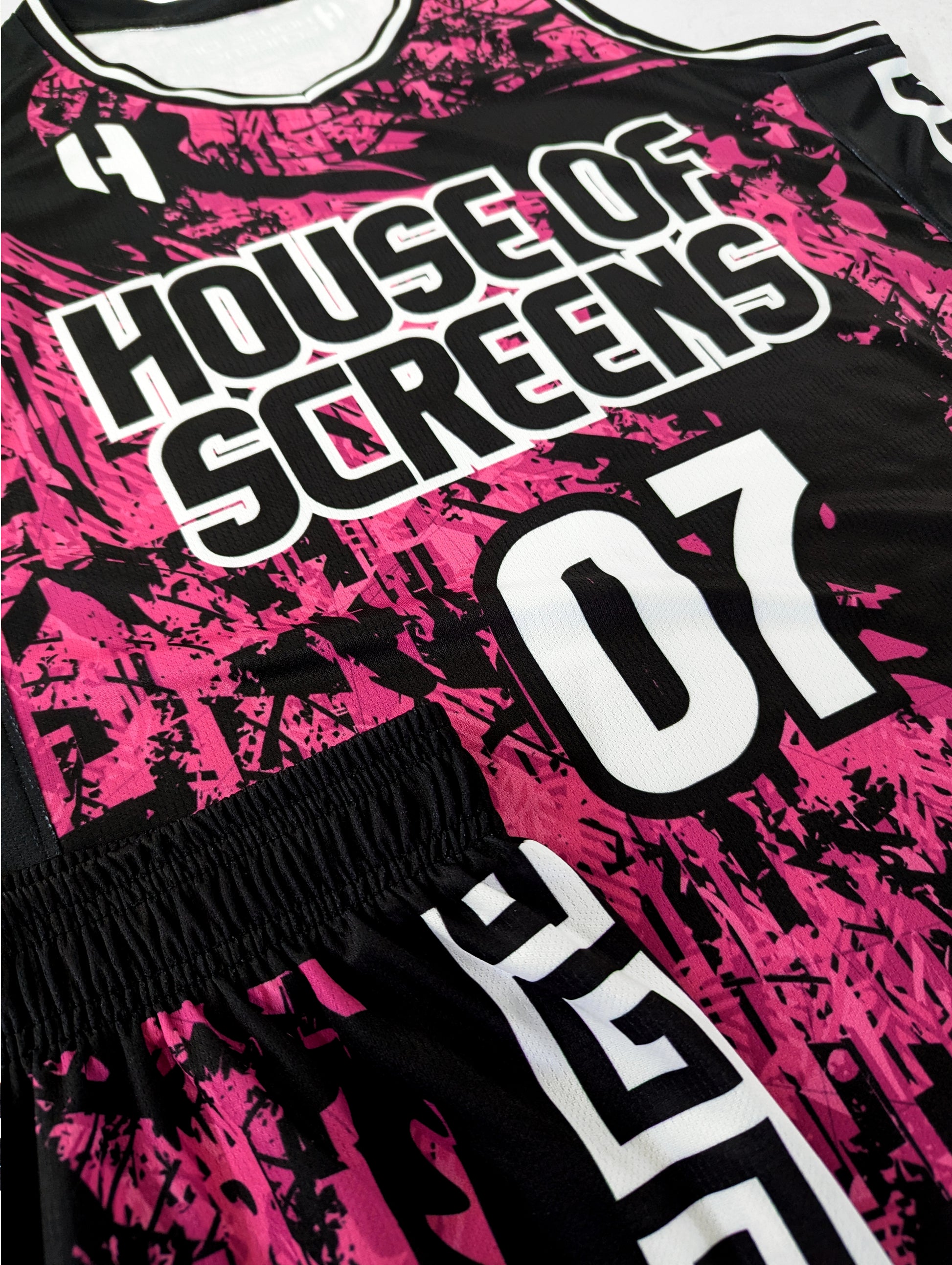 Note: This design was made for another team. You'll receive the same design without the logo displayed on the chest. It'll be printed with a team name of your choice, along with the player name and number and back above the name will have House of Screens branding.  It'll be in the format below.